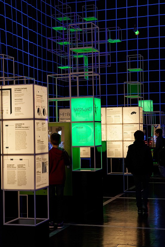 The various exhibition devices are outlined and structured by the grid: seats, screens, luminous surfaces, tables, partitions, display windows containing various artifacts, technical blocks, mirrors which multiply the grid and allow entry into parallel worlds.