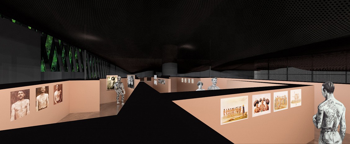 Des extraits de corps tournent lentement derrière des drapés voilés joignant le sol au plafond. A travers des orifices à la fois amples et tenus, les corps tatoués s’offrent aux regards respectueux.