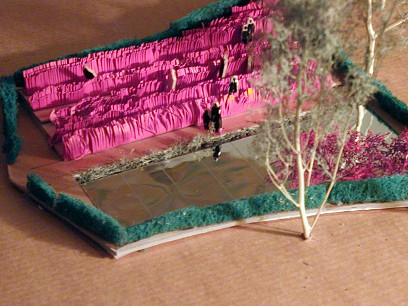 This is a sound garden. The poem occurring continually here is itself an element of the garden, and not an added element. The spoken poem, the flat mirror, the red flowerbed on the mirror, the very tall grass pathways and the nature of the soil are all major structural elements of the garden