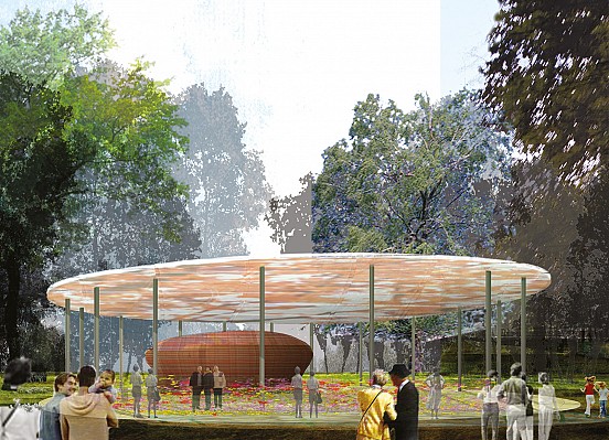 Des corps sensibles dans une densité végétale La densité est une prise de position par rapport au contexte. Un site ouvert, pris entre les flux, un « trognon de ville ». Un site bruyant, peu propice en l’état à la création d’un jardin. L’enjeu de notre proposition consiste à créer par la densité, de l’intériorité, celle-là même dont un jardin à besoin. Un jardin est un espace protégé, celui-ci doit l’être d’autant plus qu’il comporte des espaces paysagers et architecturaux sensibles. Les arbres ont une fonction de membrane et les architectures, prises dans la densité végétales sont des corps singuliers, sensibles et réactifs.